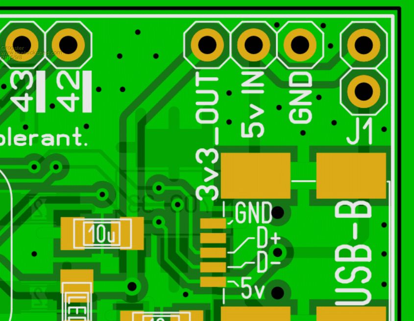 Yes Grogs, that looks great. If you want to fine tune the layout you could swap Vbus and +5V on the two pin jumper and then push the pins slightly closer to the ground pin so that the spacing between the Vbus jumper pin and the ground pin is 0.1". That way someone could solder the single Vbus jumper pin on the underside of the board and have a row of four breadboard compatible pins with Vbus on one of them. It might not get used much but it would enable someone to wire their own circuit connecting Vbus to +5V (perhaps using Rob's circuit). Yes, they are tough little chips. When I was developing the Maximite I accidentally ran an MX795 on 5V for a few hours and it survived. Geoff Geoff Graham - http://geoffg.net |