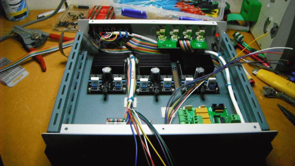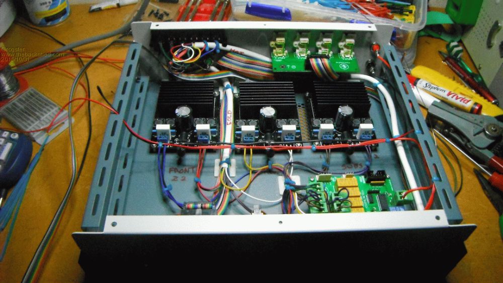 One amp for front, one amp for rear, one amp for subs. EDIT: Oh, forgot to mention: Four holes in back panel are for the subs, but I ran out of banana sockets. The 6-way speaker connector deals with front, zone 2 and rear speaker sets. Smoke makes things work. When the smoke gets out, it stops! |