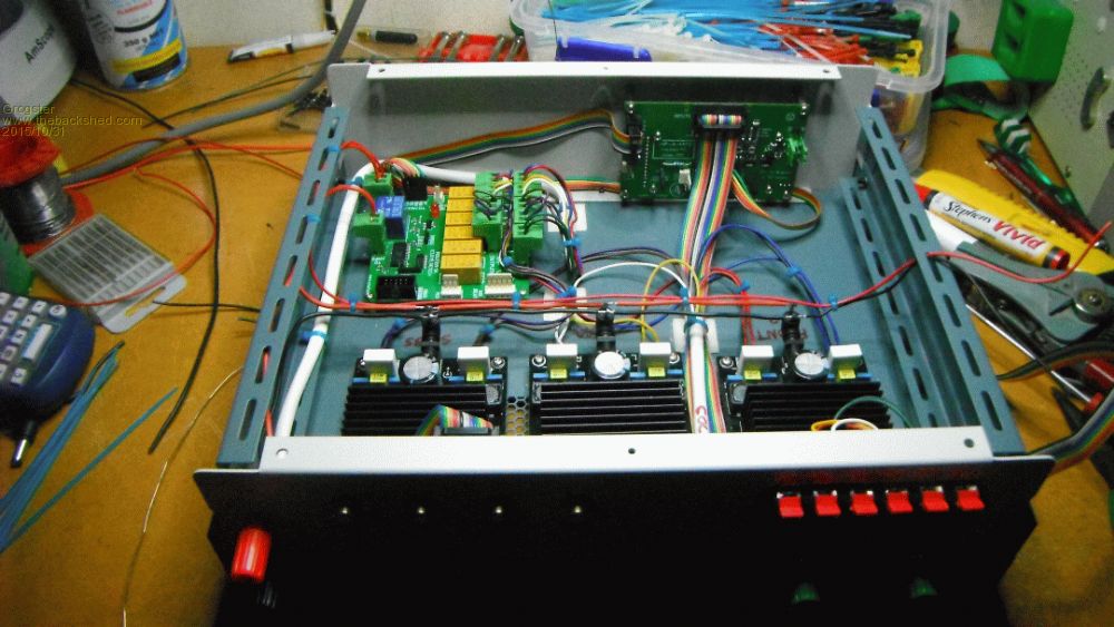 However, you can see how the 'COLD' cable connects all the negatives to the respective speaker outputs, and the 'HOT' cable comes from the de-thump/routing board which will switch speakers on and off as desired etc. There is a third 8-core cable to go in yet, connecting the amp hot outputs to the relay board. Also still have to fit buck-regulator on main PSU rail to supply 12v to the MM-based electronics and relay board, and also still have to install and route the main 32v bus. I will post more photos when the wiring is complete. Almost ready to actually do some testing!!!!