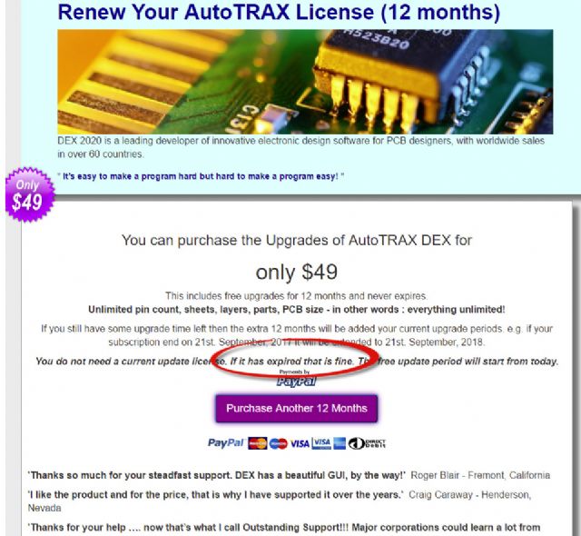 @Geoff, I asked that question and it appears that the situation is as follows. (My words interpreting these statements) The INITIAL purchase of the software including 12 mths updates is $99US. A new 12 months of UPDATE license is $49. My words here, Whilst those are the RRP prices, from time to time Iliya offers reduced prices on both, as he see fit to do.. In answer to your question.. If your update license has expired you need only pay the UPDATE fee (whatever that happens to be at the time) to continue to receive updates.