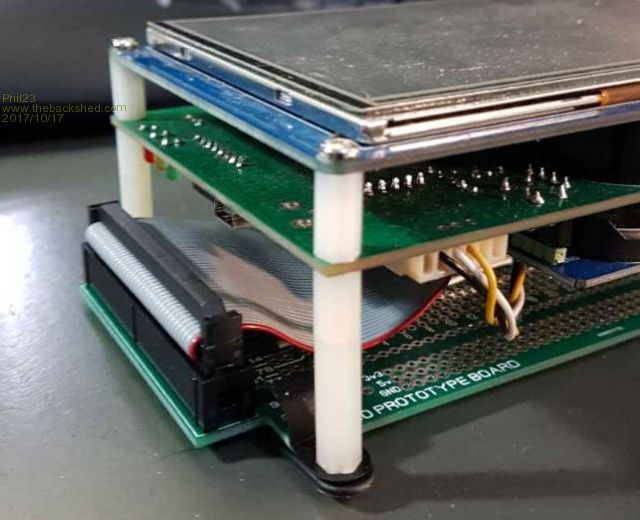 I ended up slotting one hole out & then using washers to grab the PCB on the other edge to sandwich the 3 boards. (Display, E100 & Proto).