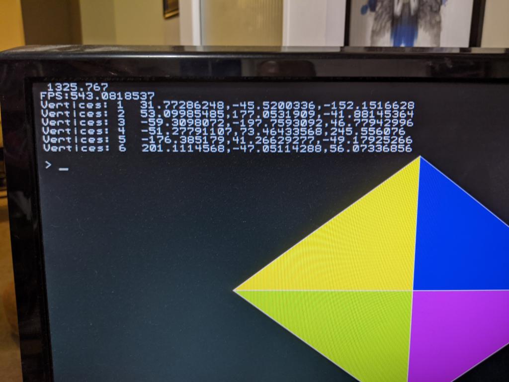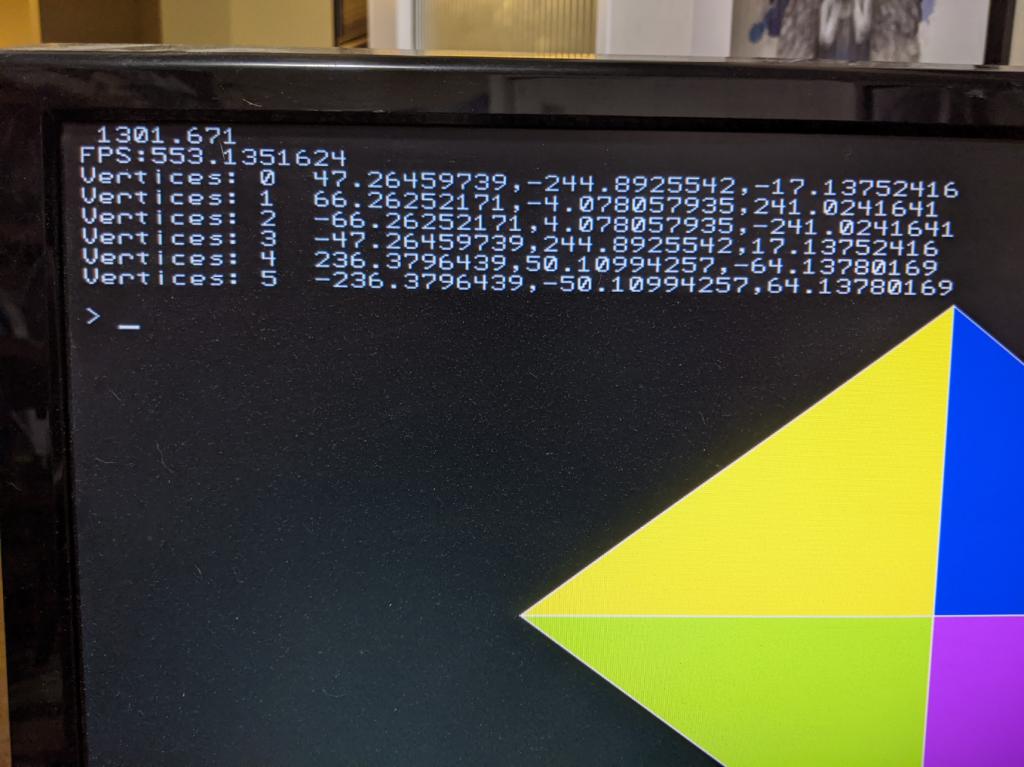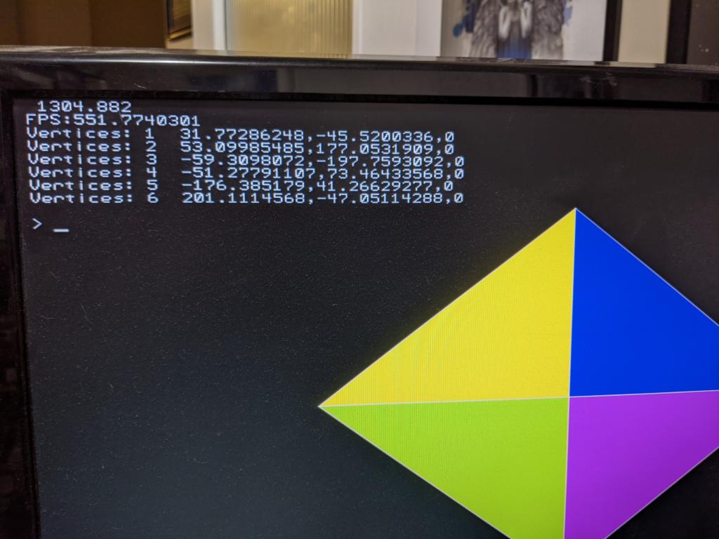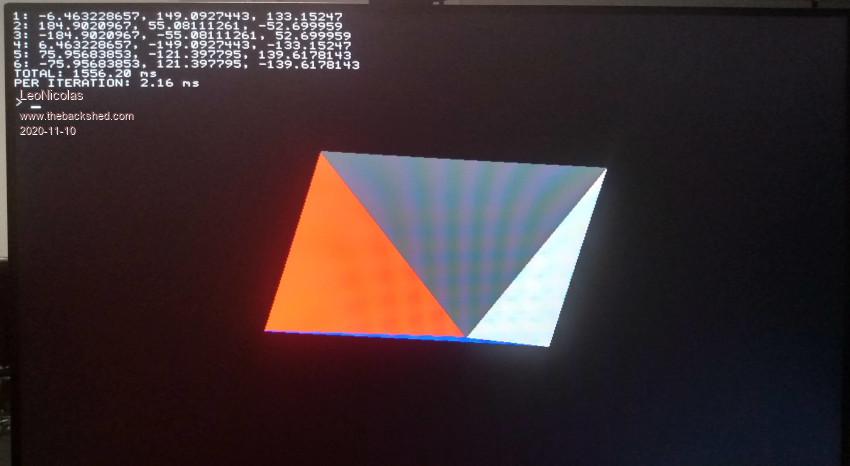 Some times: full draw : 1583 ms by commenting out sections no triangle draw : 705 ms no rotation : 1235 ms no image erase : 1419 ms no hidden face : 2475 ms The 'no hidden face' result is interesting. It looks like it is because only 4 triangles are drawn when hidden faces are removed, all 8 are drawn without hidden face removal. Suggests an average of about 120ms per triangle over the 720 iterations. My triangle code is triangle tx0+cx,ty0+cy,tx1+cx,ty1+cy,tx2+cx,ty2+cy,c(&h0),c(&h0) which includes some calculations to center the image on the screen.And of course my vertex coordinates at iteration 650 don't match anyone else's, plus my end position seems different too. ![]() Edited 2020-11-10 12:07 by vegipete Visit Vegipete's *Mite Library for cool programs. |