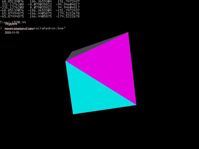z = 0? Those are projected coordinates? I get one rotation of the octahedron every roughly 157 iterations. Which, curiously, is about pi divided by 2, multiplied by 100... ??? Visit Vegipete's *Mite Library for cool programs. |