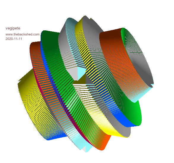 There is something strange with your vertex coordinates. I just checked the first one and the vertex is not 250 from the origin. I would expect the square root of the sum of the squares of x, y and z to be 250. I can't tell for sure but I think LeoNicolas is getting a similar result to me, just with a reflection difference, perhaps from dealing with y axis up or down, etc. In one of the posts, matherp described which direction the image should rotate for each of the x, y and z rotations. I made sure my orientations matched that. Ah, tenth post, on first page My intuition suggests the combined moves will rotate the object faster than individual moves, hence the non-alignment after 720 iterations. Visit Vegipete's *Mite Library for cool programs. |