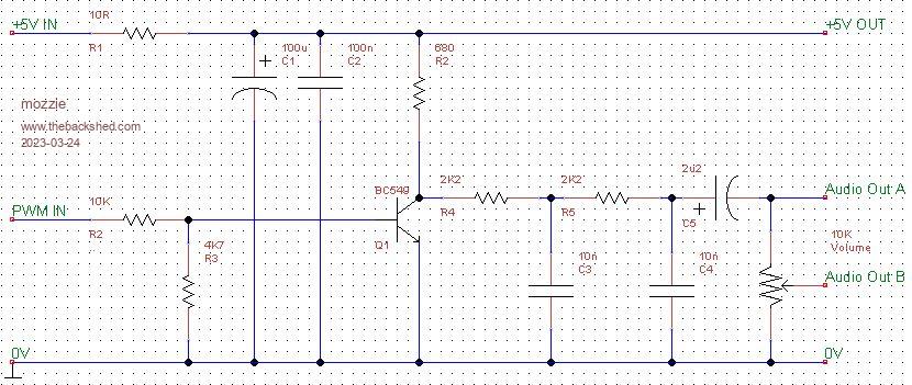 With suggested circuit by Mozzie that is not important. The 5V should be noise free. Note that the circuit with a BC549 to convert the 3.3V PWM signal to a 5V PWM signal, and feed that through a low pass filter (2.2k/10n 2x.). It is not a very good filter (-3dB at 2.7kHz, -30dB @ 44kHz), but it is a filter. Volhout P.S. there is a minor problem with Mozzie's circuit, in that the BC549 is not a very fast switcher when driven from 10k. Especially when the PWM reaches 0% or 100% (the audio sine wave is at minimum or maximum) there will be distortion. A 5V powered logic gate would be better in this application. P.P.S. amnesie's audio filter (the one with the 1.5mH inductor and the 4871 audio amplifier has very similar characteristics as Mozzie's filter. No sure I would make that the reference for anything else than that particular speaker. Maybe the combination is good, but I expect listening to CD quality audio (attachning good headphones/amplifier) will not satisfy (me not). Edited 2023-03-24 23:11 by Volhout PicomiteVGA PETSCII ROBOTS |