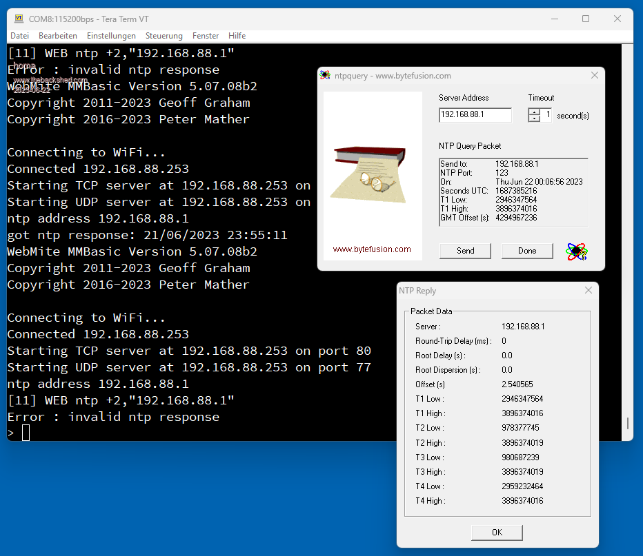 NTP server on a MikroTik router with a WebMite causes problems. If the AP has no internet (but the time and internal clock are correct!), the NTP query does not work with the WebMite. A test tool "ntpquery", on the other hand, has no problems (regardless of whether the AP has internet or not!). Is there possibly a bug in the ntp query of the WebMite? ![]() Matthias |