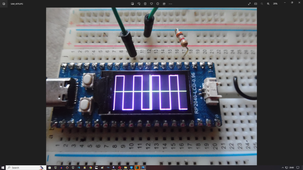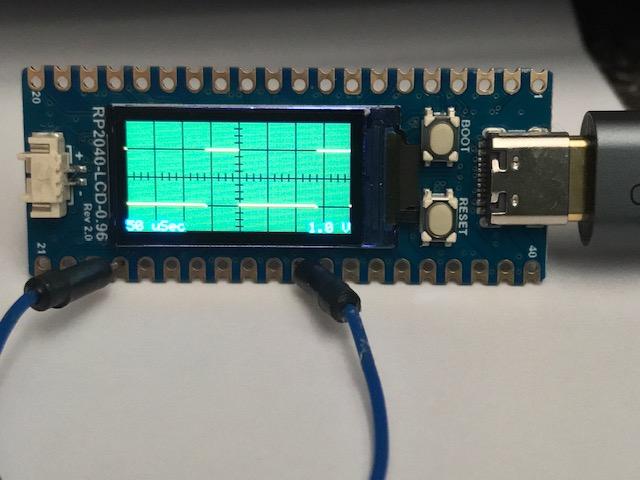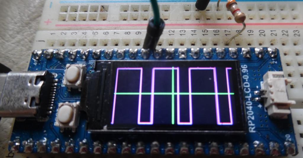 Ta Mick. It's not a "real" scope but could be useful.. my code is short and shows pwm signal or sound ..after filter. Assuming it's a repetitive wave then oversampling more than the display width and finding a trigger sort of works ok but my trigger is too simple to be true. SetPin GP18,pwm1A 'this optional test signal comment out PWM 1,9876,30 'square wave ,this optional test signal comment out dim c%,x%,samples!(320) SETPIN (31), AIn adc open 500000,1 'samples per second FRAMEBUFFER CREATE F FRAMEBUFFER LAYER L FRAMEBUFFER WRITE L line 79,0,79,79,,rgb(green) line 0,39,159,39,,rgb(green) FRAMEBUFFER WRITE F do adc start samples!() 'get new samples 'trigger c%=0 do:If samples!(c%) > 0.1 then if samples!(c%+1) < 0.2 then exit do inc c%:loop while c%<160 math scale samples!(),79,samples!()'scale to 80 pixel height FRAMEBUFFER COPY L,F for x%=0 to 158 'screen width line x%,samples!(x%+c%),x%+1,samples!(x%+1+c%),,rgb(magenta) 'draw new sample from sample(c%) next x% FRAMEBUFFER COPY F,N loop |