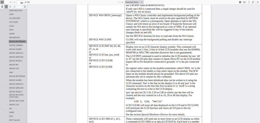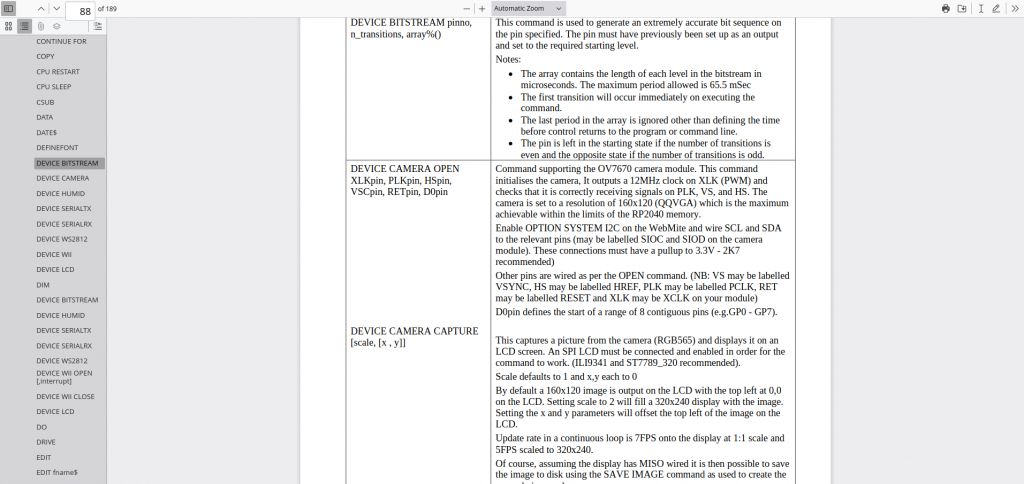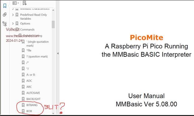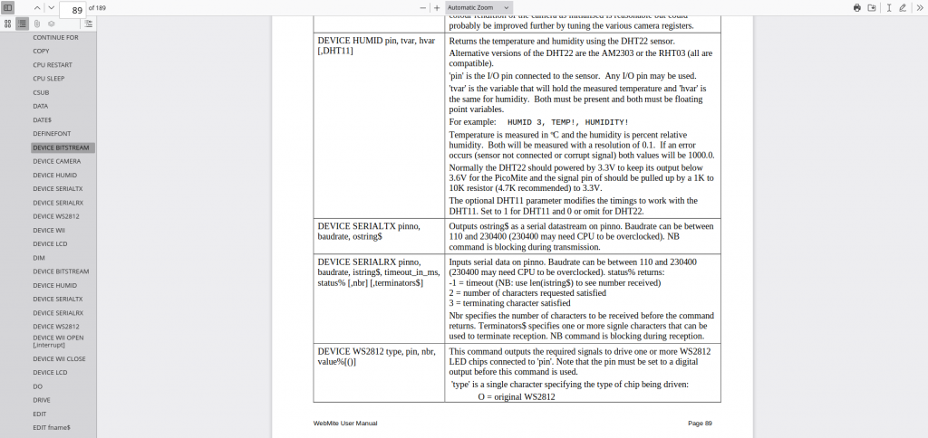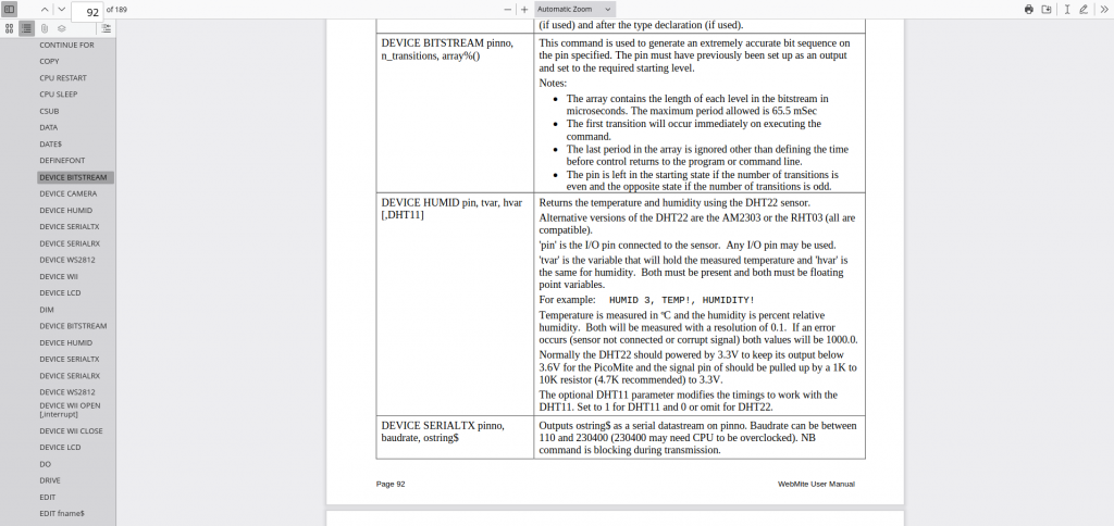 Geoff It is the WebMite Manual Device Bitstream page 88 repeats on 92 Device Humid page 89 repeats on 92 Device SerialTx and Rx page 89 repeats on 92 and 93 Device WS2812 page 90 repeats on 93 Device WII Open page 90 repeats on 93 Device LCD page 90 repeats on 93 Dim is out of place Wayne !!! ` |