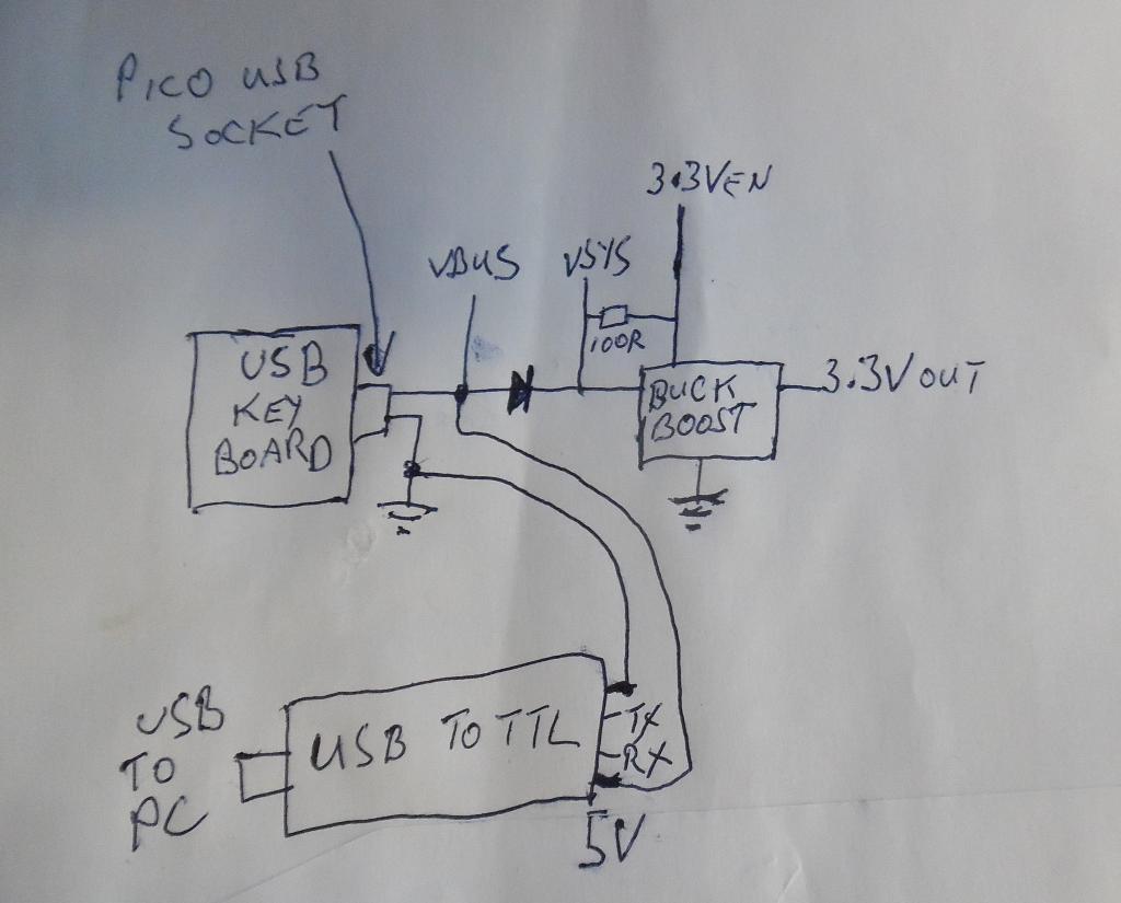 Mick, these are my connections. usb to ttl 5V to vbus, that powers the usb keyboard and through the diode to the switching reg and 3.3V out. if I update firmware then disconnect usb to ttl and usb kb then hold button and connect to pc usb or it will power usb to ttl in reverse, maybe bad edit doh I soldered the usb to ttl so I'll stick a Schottky diode in the 5V from usb to ttl to vbus so safe ![]() Edited 2024-02-27 04:41 by stanleyella |