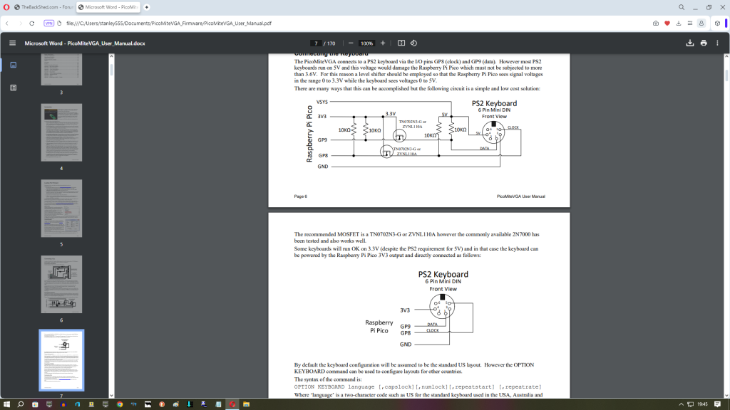 The keyboard is powered from what it's plugged into. If you power them from 3V3 some will work and some won't, but you don't need level shifters. If you power them from 5V then they all work but you do need level shifters for a RP2040 (you can get round it with RP2350s in some cases). USB keyboards always expect 5V and you shouldn't attempt to run a 3V3 USB system - there'll be tears if you do. The hard wiring of the interfaces is only half the job. It doesn't work unless the firmware and keyboard hardware supports it. . Edited 2024-10-03 06:09 by Mixtel90 Mick Zilog Inside! nascom.info for Nascom & Gemini Preliminary MMBasic docs & my PCB designs |