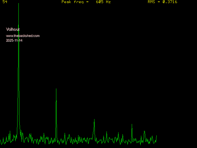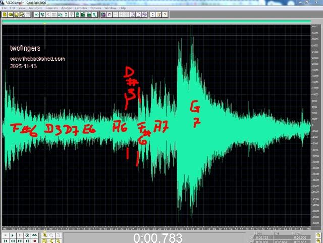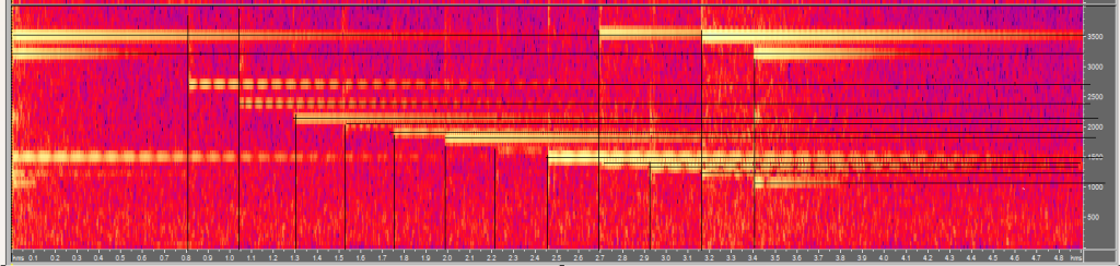 To summarize the results from Phil's and my tests. We found 14 separate notes. Two more than the number of bells. With a less noisy recording, we could probably eliminate the phantom notes. The majority of the tones are half way between standard notes. Piano tone standard note key found 85 3520.0 Hz A 7 3487 84 3322.4 Hz G#7 3200 83 3136.0 Hz G 7 82 2960.0 Hz F#7 81 2793.8 Hz F 7 2680 80 2637.0 Hz E 7 79 2489.0 Hz D#7 2375 78 2349.3 Hz D 7 77 2217.5 Hz C#7 2140 76 2093.0 Hz C 7 2016 75 1975.5 Hz B 6 1899 74 1864.7 Hz A#6 1803 73 1760.0 Hz A 6 72 1661.2 Hz G#6 1607 71 1568.0 Hz G 6 1487 70 1480.0 Hz F#6 1403 69 1396.9 Hz F 6 1349 68 1318.5 Hz E 6 67 1244.5 Hz D#6 1240 66 1174.7 Hz D 6 65 1108.7 Hz C#6 1080 64 1046.5 Hz C 6 First column is the piano key number second column is the tones found in the recording finally the standard notes as a reference. The interval between notes was a consistent (considering electro-mechanical parts) 240mS or multiple of. I don't have a musical bone in my body so there may be errors in the descriptions Jim VK7JH MMedit |