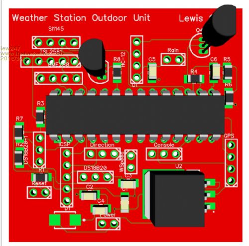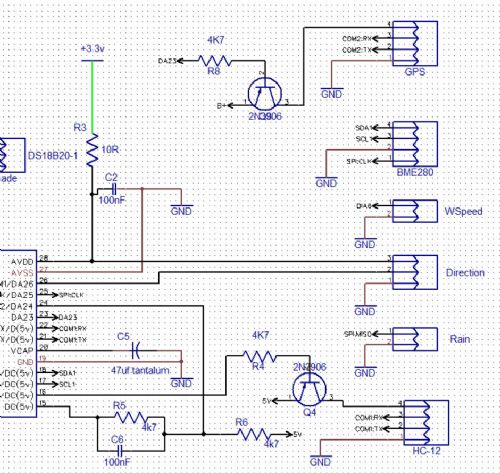 A couple of notes: I changed the diode (D1) to a STPS1L30U It's cheaper and smaller - it uses an smb footprint DS18B20 could pin 2 labelled Sun could Pin 3 labelled Shade and Rain pin 2 labelled Speed GPS needs power to go via transister/resistor/5V (or 4.7v) and pin 23 although I can use Pin 7 if you want as thats already on the board? See image below (this is to conserve power) |