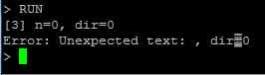 Morning Peter. Got another odd one for you. Isn't a problem but the corrupt character might signal something darker... Try running this tiddly bit of code: dim integer n,dir n=0, dir=0 Obviously the error is the comma on the last line but whence comes: ![]() EDIT: just tried this on a MkII 44-pin jobby and it does the same - this looks like a long lived wrinkle in the root MMBasic code so @Geoff also |