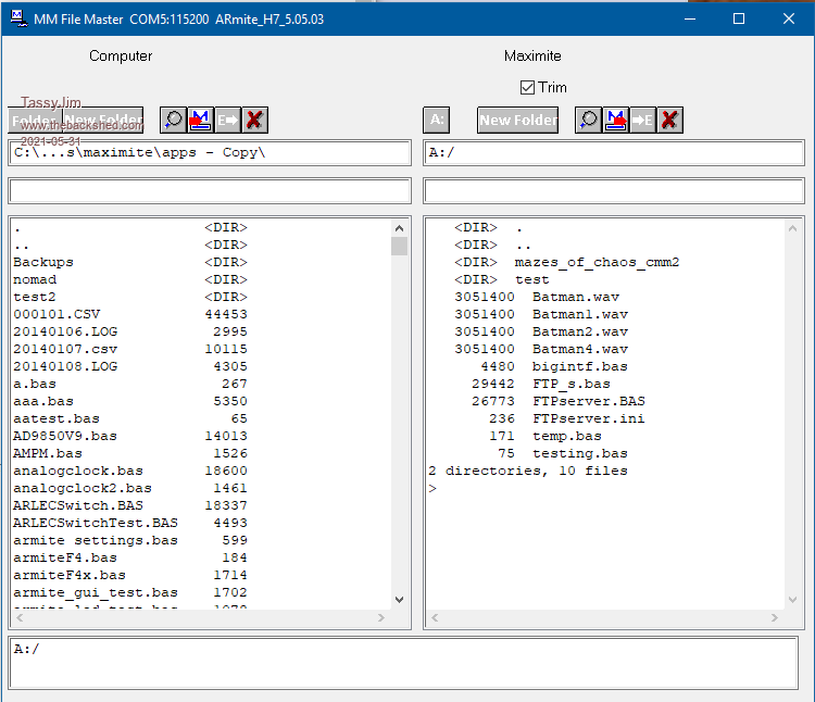 Now I have updated the DLL that MMEdit uses, I can talk to the pico The File Manager seems to work without jumping through any hoops. Just select ArmiteH7 as the syntax. ![]() Required DLL LBcoms.zip Put it in the MMEdit program folder Even if this doesn't go any further, it has been an interesting couple of days... Jim Edited 2021-05-31 12:43 by TassyJim VK7JH MMedit |