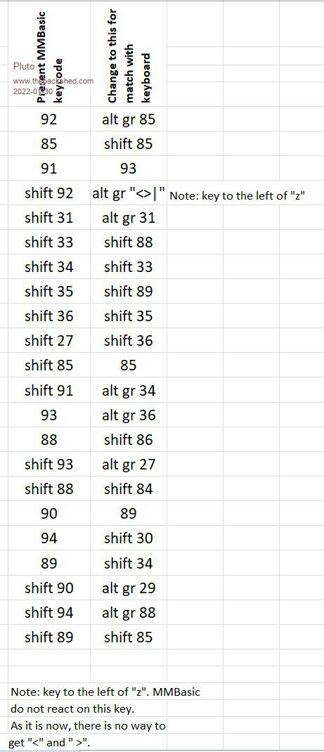 New version pa5 MMBasic.zip Still no keyboard language support but most of the infrastructure is now there. This version will automatically re-initialise the options on first run as the structure has changed. Now working: keyboard repeat on key (both variants - see PicoMite manual) option list Caps lock (properly I hope) F1 now set to FILES, F5-F9 are user settable as per PicoMite KEYDOWN function as per CMM2 To set the keyboard repeat use OPTION KEYBOARD lang, repeatstart, repeatrate The rates are in milliseconds. The language is ignored but is currently one of "US", "FR", "GR", "IT", "BE", "UK", "ES" Remember: Use OPTION DEFAULT MODE to select the screen format on running. This automatically chooses a sensible font for the screen size. You can't select the small screen sizes which make editing silly Use OPTION DEFAULT FONT number, scale to select the font on running. This overrides the automatic selection caused by DEFAULT MODE Valid Default modes are: Default mode 8", "800x600" Default mode 8", "640x480" Default mode 9", "1024x768" Default mode 10", "848x480" Default mode 11", "1280x720" Default mode 12", "960x540" Default mode 15", "1280x1024" Default mode 16", "1920x1080" Default mode 18", "1024x600" Next steps finalise keyboard language support. Edited 2022-01-31 02:29 by matherp |