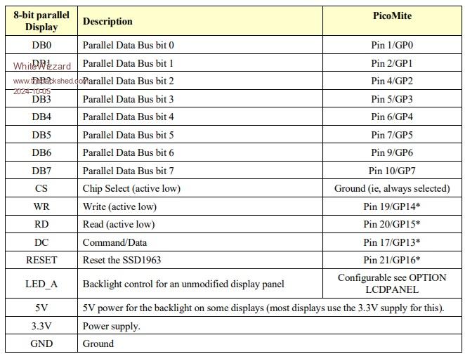 I am using the standard 2350 firmware RC4 (ie nonHDMI/nonUSB) on a RPI Pico2. Connecting a 5” SSD1963 as per Pico manual (DB0-DB7 to GP0-GP7, etc). Known working display as it works on 44pin MM (configured for 5V operation, with SSD backlight control, on 8080 interface). I can successfully control the backlight intensity with the BACKLIGHT xx command which confirms all signals and DB lines are correctly connected. BUT the display remains ‘black’ and it is not possible to see anything on the display (apart from the backlight ‘bleed’). Trying GUI TEST LCDPANEL as well as CLS RGB(colour_name) I have tried OPTION LCDPANEL SSD1963_5,L and also _5A (and 7 and 7A just in case this made a difference!) but no matter what I try the display remains ‘blank’. Is anyone able to test RC4 with an SSD display to confirm if they’re able to see something on the display. I will try a 7” and 9” sometime in the coming days, but really want the 5” to work for a specific project. Any confirmation (or suggestions) would be greatly appreciated…. |