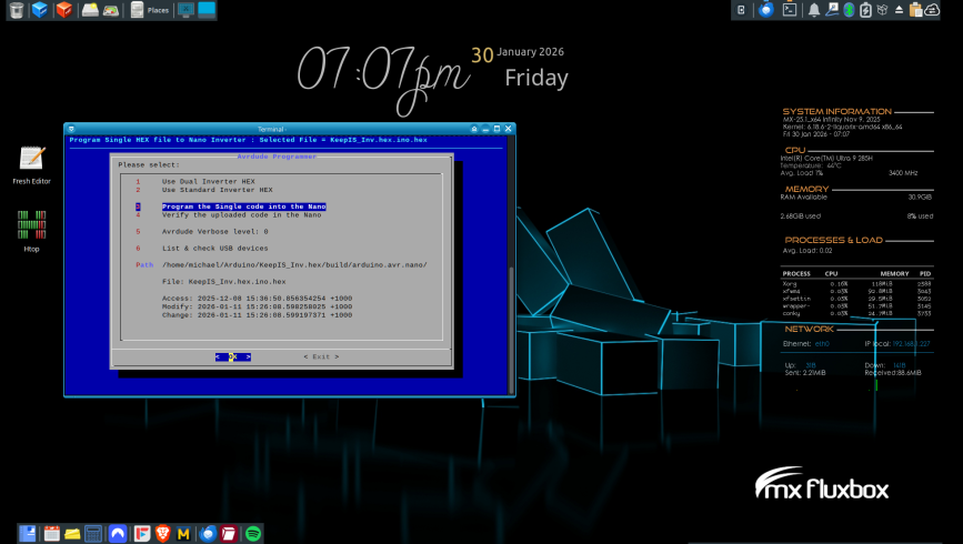 I'm sure some of the earlier distros also have these GUI interfaces, but MX is another community driven distro and like Mint, they have an enthusiastic group involved, I was attracted to the latest Linux Kernel release with latest drivers associated with it. The only thing you may have trouble with is getting MMEdit to run, I haven't gone fully into it, but it still complains about missing Libraries, even though they have been fully installed, so likely some permission based problems with Snandboxing and security in these newer releases, some linux distros will allow you to specify no-snandbox when attempting to run with sudo (just to see if it will run and access the Lib files) but MX 25 will explicitly tell you NO! not allowed. I followed the install info from Jim and still nothing, worked in Zorin though. BTW the Arduino package is the 64bit IDE V2 Appimage from the Adruino website, runs perfectly. NANO Inverter: Full download - Only Hex Ver 8.2Ks |
