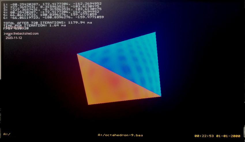 Probably you can improve your time using matrix math operations instead of using basic to perform calculations. With exception of the projection, I'm performing all operations using matrix math. For rotation, I changed the loop to rotate each vertice to pure matrix multiplication. I'm performing 3 multiplications, one per axis. I'll try to figure out a way to rotate the 3 axis with only one matrix multiplication. If I'm able to do it, I can reduce my time. Thanks. I have been calculating the matrix long hand. I didn't realise there was a built in matrix operation until you just mentioned it. Well, that's not 100% true. I read through the manual before and saw it, but in my old age I'm forgetting lots of things! I'll try it out this evening when I finish work. Edited 2020-11-13 05:48 by PeteCotton |