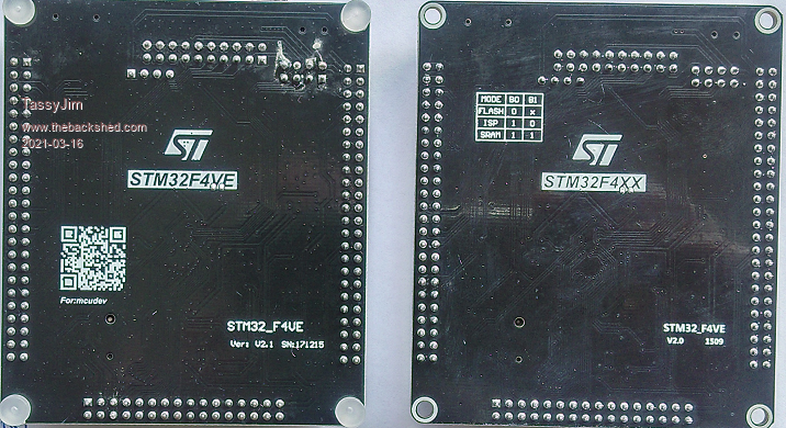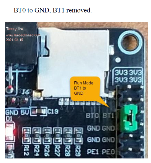I went through my small collection of F407 boards. The ones with STM32F4VE and Ver: 2.1 on the back work as expected with one jumper required for flashing and all jumpers removed for normal use. I do have one board that has STM32F4XX and V2.0 on the back. It does definitely have a STM32F407VET6 processor. On that board, I have to have the two jumpers in place for flashing and the BT0 to ground jumper in place for normal use. In other words, that board does NOT have the pulldown resistors shown in the circuit diagram and mentioned in the manual. If you are having trouble getting the serial to work once flashed, try with a jumper from BT0 to GND I don't have any jumper on BT1 ![]() The text on the photo (taken from the manual) is incorrect. It should read BT0 to Ground Jim VK7JH MMedit |