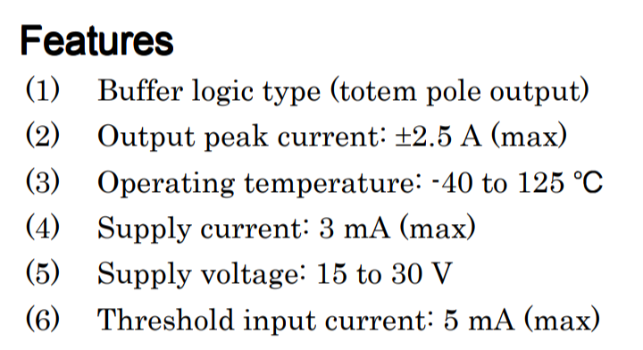 Check out the conditions for the 2.5A (note 2) Note 2: Exponential waveform. Pulse width < 0.3 us, f < 15 kHz If I'm not badly mistaken, both the TLP350H and VOM1271 are drivers not load switching devices. The VOM1271 may be able to drive Bob's MOSFETs but not drive the load directly. Beware, if you let the magic smoke out it won't go back in. Bill Keep safe. Live long and prosper. |