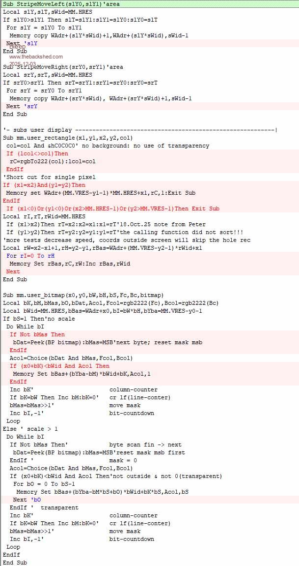 Hi Kevin, Thank you very much for your support, ideas, and testing for this project. I have incorporated your changes. I wasn't aware that the move function was used so much. I've made a few more changes here. Sub StripeMoveLeft(slY0,slY1)'area Local slT,sWid=MM.HRES,sDec=sWid-1 If slY0>slY1 Then slT=slY1:slY1=slY0:slY0=slT Local sSrc=WAdr+slY0*sWid,sEnd=WAdr+slY1*sWid For slT=sSrc To sEnd Step sWid:Memory copy slT+1,slT,sDec Next ' slY End Sub Sub StripeMoveRight(srY0,srY1)'area Local srT,sWid=MM.HRES,sDec=sWid-1 If srY0>srY1 Then srT=srY1:srY1=srY0:srY0=srT Local sSrc=WAdr+srY0*sWid,sEnd=WAdr+srY1*sWid For srT=sSrc To sEnd Step sWid:Memory copy srT,srT+1,sDec Next ' srY End Sub I can't explain why it's faster when the loop-start is on the same line as the statement and the “next” is on a new line. Maybe Peter can say something about that. The collected improvements in zip. Hub75UserGen.zip @Volhout The Hub75 protocol expects the pixel data to be mixed from the upper and lower halves of the screen. I don't know if the blitter can do that. Apparently, only WebMite supports this buffer. When we query the address(MM.INFO(WRITEBUFF)), we always get “0”. Albert Edited 2025-12-04 01:09 by AlbertR |