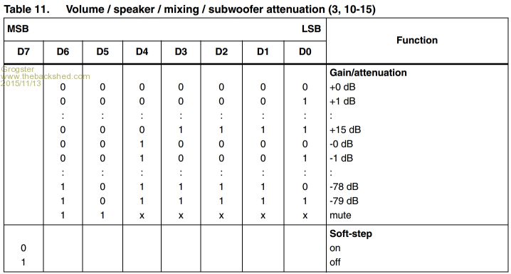 My Take on the Volume Personally I like it db and code below solves the TDA7419's odd volume scale problem The DisplayVolume Sub takes care of the sign so the display is from +15 to -80 '===================================================== Sub VolumeUp Volume = Volume + 1 If Volume >= 15 Then Volume = 15 If Volume < 0 Then VolumeD = (Volume * -1) + 16 Else VolumeD=Volume EndIf DisplayVolume End Sub '==================================================== Sub VolumeDown Volume = Volume -1 If Volume <= -80 Then Volume=-80 If Volume < 0 Then VolumeD = (Volume * -1) + 16 Else VolumeD=volume EndIf DisplayVolume End Sub '==================================================== Jman |