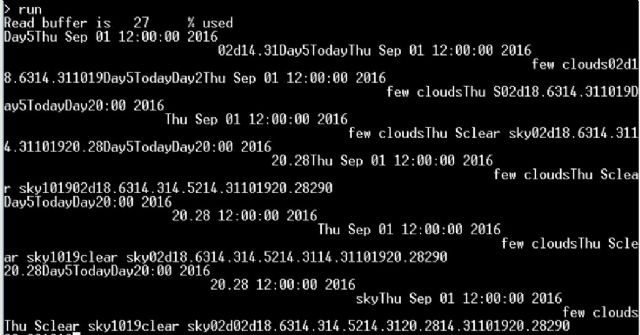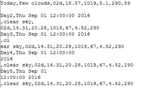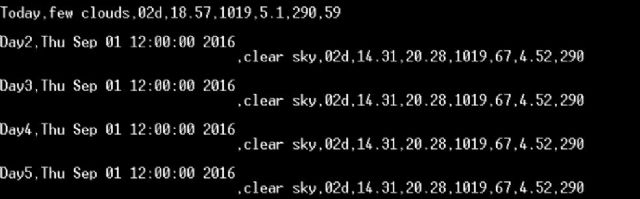 If it helps anyone this is NOW what is coming in the serial port of the Micromite There is a pause of 1000 before each serial string is sent (1 second between each line) [code]Update Time Wed:12:53:23 Today,scattered clouds,03d,19.72,1018,5.7,290,82 Day2,Thu Sep 01 12:00:00 2016,clear sky,02d,14.09,20.06,1018,67,4.52,290 Day3,Fri Sep 02 12:00:00 2016,moderate rain,10d,13.82,20.02,1018,91,6.19,290 Day4,Sat Sep 03 12:00:00 2016,heavy intensity rain,10d,12.24,18.25,1018,80,4.76 Day5,Sun Sep 04 12:00:00 2016,light rain,10d,8.2,17.8,1018,0,3.83[/code] |
