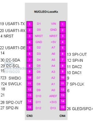 PA2 is console TX (broken out as A7) PA15 is console RX (not broken out on Nucleo) No, these pins are not broken out on the Nucleo D7 and D8 are the 32KHz xtal pins so not usable The Nucleo manual is the source for the pin allocation of D0 to 12 and A0 to 7 All MMBasic special purpose pins by chip size are given below: The syntax : INT1PIN (HAS_32PINS ? 6 : (HAS_48PINS ? 10 : 14)) //PA0 means INT1PIN is on pin 6 for 32-pin, pin 10 for 48 pin and pin 14 for 64 pin and uses PA0 in all cases. INT pins are the COUNT pins INT1PIN (HAS_32PINS ? 6 : (HAS_48PINS ? 10 : 14)) //PA0 INT2PIN (HAS_32PINS ? 22 : (HAS_48PINS ? 33 : 45)) //PA12 INT3PIN (HAS_32PINS ? 15 : (HAS_48PINS ? 19 : 27)) //PB1 IRPIN (HAS_32PINS ? 6 : (HAS_48PINS ? 10 : 14)) //PA0 //COUNT5 (HAS_32PINS ? 11 : 15) //PA5 // I2C pin numbers P_I2C_SCL (HAS_32PINS ? 29 : (HAS_48PINS ? 42 : 58)) //PB6 P_I2C_SDA (HAS_32PINS ? 30 : (HAS_48PINS ? 43 : 59)) //PB7 // Console pin numbers CONSOLE_RX_PIN (HAS_32PINS ? 25 : (HAS_48PINS ? 13 : 17)) //PA15/PA3/PA3 USART2 CONSOLE_TX_PIN (HAS_32PINS ? 8 : (HAS_48PINS ? 12 : 16)) //PA2 // COMx: port pin numbers COM1_TX_PIN (HAS_32PINS ? 19 : (HAS_48PINS ? 30 : 42)) //PA9 USART1 COM1_RX_PIN (HAS_32PINS ? 20 : (HAS_48PINS ? 31 : 43)) //PA10 COM1_EN_PIN (HAS_32PINS ? 22 : (HAS_48PINS ? 33 : 45)) //PA12 COM2_TX_PIN (HAS_32PINS ? 0 : (HAS_48PINS ? 21 : 29)) //PB10 USART3 COM2_RX_PIN (HAS_32PINS ? 0 : (HAS_48PINS ? 22 : 30)) //PB11 // SPI pin numbers SPI_CLK_PIN (HAS_32PINS ? 7 : (HAS_48PINS ? 11 : 15)) //PA1 SPI_INP_PIN (HAS_32PINS ? 12 : (HAS_48PINS ? 16 : 22)) //PA6 SPI_OUT_PIN (HAS_32PINS ? 13 : (HAS_48PINS ? 17 : 23)) //PA7 SPI2_CLK_PIN (HAS_32PINS ? 26 : (HAS_48PINS ? 39 : 55)) //PB3 SPI2_INP_PIN (HAS_32PINS ? 27 : (HAS_48PINS ? 40 : 56)) //PB4 SPI2_OUT_PIN (HAS_32PINS ? 28 : (HAS_48PINS ? 41 : 57)) //PB5 SPI3_CLK_PIN (HAS_32PINS ? 0 : (HAS_48PINS ? 26 : 34)) //PB13 SPI3_INP_PIN (HAS_32PINS ? 0 : (HAS_48PINS ? 27 : 35)) //PB14 SPI3_OUT_PIN (HAS_32PINS ? 0 : (HAS_48PINS ? 28 : 36)) //PB15 // DAC pin numbers DAC_1_PIN (HAS_32PINS ? 10 : (HAS_48PINS ? 14 : 20)) //PA4 DAC_2_PIN (HAS_32PINS ? 11 : (HAS_48PINS ? 15 : 21)) //PA5 // // PWM pin numbers PWM_CH1_PIN (HAS_32PINS ? 18 : (HAS_48PINS ? 29 : 41)) //PA8 - PWM1A PWM_CH2_PIN (HAS_32PINS ? 21 : (HAS_48PINS ? 32 : 44)) //PA11 - PWM1B PWM_CH3_PIN (HAS_32PINS ? 19 : (HAS_48PINS ? 30 : 42)) //PA9 - PWM1C PWM_CH4_PIN (HAS_32PINS ? 20 : (HAS_48PINS ? 31 : 43)) //PA10 - PWM1D PWM_CH5_PIN (HAS_32PINS ? 9 : (HAS_48PINS ? 45 : 61)) //PA3/PB8/PB8 - PWM2A |