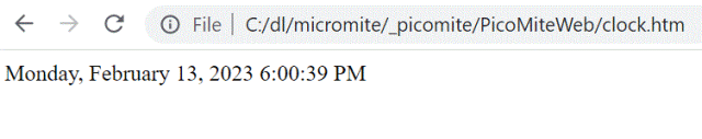 Without having any real understanding of how it might work with the PicoMiteWeb, I thought/hoped that javascript might work, since as I understand it, execution is on the PC side. I have a little html file which presents Day of Week, Month, Day, Year, Time (with the time updated second by second). This works when I just put the local address of the file in a browser line: file:///C:/dl/micromite/_picomite/PicoMiteWeb/clock.htm ![]() When I try to serve it from the PicoMiteWeb, I get a syntax error: >run ntp address 162.159.200.123 got ntp response: 13/02/2023 15:26:41 String is GET / HTTP sending page [33] WEB transmit page ii%,"clock.htm" Error : Expression syntax > Here's the HTML: <html> <div id="clockbox"></div> <script type="text/javascript"> var tday=["Sunday","Monday","Tuesday","Wednesday","Thursday","Friday","Saturday"]; var tmonth=["January","February","March","April","May","June","July","August","September","October","November","December"]; function GetClock(){ var d=new Date(); var nday=d.getDay(),nmonth=d.getMonth(),ndate=d.getDate(),nyear=d.getFullYear(); var nhour=d.getHours(),nmin=d.getMinutes(),nsec=d.getSeconds(),ap; if(nhour==0){ap=" AM";nhour=12;} else if(nhour<12){ap=" AM";} else if(nhour==12){ap=" PM";} else if(nhour>12){ap=" PM";nhour-=12;} if(nmin<=9) nmin="0"+nmin; if(nsec<=9) nsec="0"+nsec; var clocktext=""+tday[nday]+", "+tmonth[nmonth]+" "+ndate+", "+nyear+" "+nhour+":"+nmin+":"+nsec+ap+""; document.getElementById('clockbox').innerHTML=clocktext; } GetClock(); setInterval(GetClock,1000); </script> <html> Am I doing something wrong, and/or is there a way to get this to work on the PicoMiteWeb (the file is named "clock.htm")? PicoMite, Armmite F4, SensorKits, MMBasic Hardware, Games, etc. on fruitoftheshed |