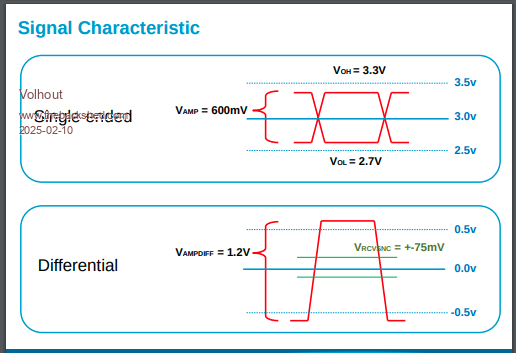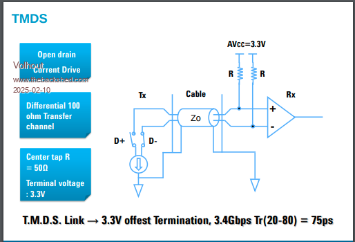 DVI and HDMI physical layer are identical. See these picture from Agilent (who make the testers for HDMI compliance). The differential termination is 100 ohm (each line has its own 50 ohm to a common 3V3 in the TV/Monitor). 50+50=100. ![]() We drive 1 pin low, the other high. For low pin the current is set by the series resistor, and the 50 ohm, and the pico output resistance that differs per drive strength setting. The high pin drives virtually no current (between pico 3.3V and 3V3 termination). ![]() Regards, Volhout P.S. about the slew rate: for 1280 (100MHz+) you will need fast slew rate. It is very well possible that at 640 slow slew rate is acceptable. Note that the HDMI spec talks about rise times of far below 1ns (1ns is a 350MHz bandwidth). But this includes far higher resolutions as well (4k). Edited 2025-02-10 01:47 by Volhout PicomiteVGA PETSCII ROBOTS |