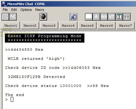 Ok, I have begun to communicate with a chip using ICSP from another MicroMite, a WhiteWizzard board with a 32MX150128D 44 pin to the subject 28 pin MX150F128B’s ICSP connector. I started with Mobi’s program but have modified somewhat. JTR0701's posts have also increased my confidence. I place the code here to help others get started. Mobi was trying to erase the chip as an early goal but I have resisted that as the PicKit3 has currently gone back to its owner. I can read the chips ID correctly which is a 32 bit number and I think the Status read is OK. Therefore some things are working. I will try to build on this but have a way to go. I will be grateful if people who are more familiar with MMBasic have a look at my code as I struggle a bit. I have particularly had trouble with using what I had hoped were global variables within subroutines. Finding that they are not visible within the sub? I am trying to minimize processing to increase speed. Using text strings for data seems helpful but may prove cumbersome later. Geoff, thank you for answering my post regarding creating a small Pclock routine. Perhaps the ability to poke a small machine code subroutine into memory from MMBasic and then being able to call it would be a more universal answer. I think this has been written about before, but have forgotten the status. A method of programming a blank chip would be to put in (using ICSP and MMBasic) a small loader that could then communicate via the subject chips hardware serial port from/to the programmer chip to speed the process. This may be faster than bit banging it all on ICSP. Whatever, getting some code in is the first step.
