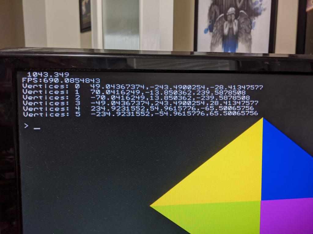 For more entertainment value, here is my program , modified to spin an icosahedron. My run time is 1517 ms. (RC18, 400 MHz Waveshare) So that is roughly 650 ms longer to process 12 corners instead of 6, and 20 faces instead of 8. This program shows a slight bug I report once before. If a program ends with font size other than 1 (my standard size is the default 1), the screen scrolls _UP_ a few pixels, based on the difference in font size. See line 316. The vertex and face data (sized to match the octahedron) I used is: icosashape: ' vertices 'data 12 data 0,132,213, 0,-132,213, 0,132,-213, 0,-132,-213 ' (0, 1, f) Where f = data 132,213,0, -132,213,0, 132,-213,0, -132,-213,0 ' (1, f, 0) (1 + v5) / 2 data 213,0,132, 213,0,-132, -213,0,132, -213,0,-132 ' ( f, 0, 1) golden ratio 1.618 ' faces 'data 20 data 1, 6, 8, 1, 8, 0, 1, 0,10, 1,10, 7 ' vertices for data 1, 7, 6, 6, 7, 3, 6, 3, 9, 6, 9, 8 ' each face in data 8, 9, 4, 8, 4, 0, 0, 4, 5, 0, 5,10 ' counter-clockwise data 10, 5,11, 10,11, 7, 7,11, 3, 3,11, 2 ' order data 2,11, 5, 2, 5, 4, 2, 4, 9, 2, 9, 3 ' Icosaspin ' vegipete, November, 2020 ' optimized for 5.05.06RC18 mode 1,8 cls timer = 0 '====================================== option angle degrees d = 800 ' distance to view plane rho = 1000 ' distance to object (center) cenx = MM.HRES/2 ceny = MM.VRES/2 restore icosashape ' read in 12 vertices dim v0(2) : read v0(0) : read v0(1) : read v0(2) dim v1(2) : read v1(0) : read v1(1) : read v1(2) dim v2(2) : read v2(0) : read v2(1) : read v2(2) dim v3(2) : read v3(0) : read v3(1) : read v3(2) dim v4(2) : read v4(0) : read v4(1) : read v4(2) dim v5(2) : read v5(0) : read v5(1) : read v5(2) dim v6(2) : read v6(0) : read v6(1) : read v6(2) dim v7(2) : read v7(0) : read v7(1) : read v7(2) dim v8(2) : read v8(0) : read v8(1) : read v8(2) dim v9(2) : read v9(0) : read v9(1) : read v9(2) dim v10(2) : read v10(0) : read v10(1) : read v10(2) dim v11(2) : read v11(0) : read v11(1) : read v11(2) dim vt0(2) ' temp vectors dim vt1(2) dim vt2(2) dim vt3(2) dim vt4(2) dim vt5(2) dim vt6(2) dim vt7(2) dim vt8(2) dim vt9(2) dim vt10(2) dim vt11(2) dim vs0(2) ' save vectors - for iteration 650 dim vs1(2) dim vs2(2) dim vs3(2) dim vs4(2) dim vs5(2) dim vs6(2) dim vs7(2) dim vs8(2) dim vs9(2) dim vs10(2) dim vs11(2) dim trot(2,2) ' total rotation matrix ' draw iteration 0 ze=rho- v0(2) : x0=-d* v0(0)/ze : y0=d* v0(1)/ze ' project 12 points ze=rho- v1(2) : x1=-d* v1(0)/ze : y1=d* v1(1)/ze ze=rho- v2(2) : x2=-d* v2(0)/ze : y2=d* v2(1)/ze ze=rho- v3(2) : x3=-d* v3(0)/ze : y3=d* v3(1)/ze ze=rho- v4(2) : x4=-d* v4(0)/ze : y4=d* v4(1)/ze ze=rho- v5(2) : x5=-d* v5(0)/ze : y5=d* v5(1)/ze ze=rho- v6(2) : x6=-d* v6(0)/ze : y6=d* v6(1)/ze ze=rho- v7(2) : x7=-d* v7(0)/ze : y7=d* v7(1)/ze ze=rho- v8(2) : x8=-d* v8(0)/ze : y8=d* v8(1)/ze ze=rho- v9(2) : x9=-d* v9(0)/ze : y9=d* v9(1)/ze ze=rho-v10(2) : x10=-d*v10(0)/ze : y10=d*v10(1)/ze ze=rho-v11(2) : x11=-d*v11(0)/ze : y11=d*v11(1)/ze if (x1-x6)*(y1-y8)<(x1-x8)*(y1-y6) then ' face 0: 1, 6, 8 triangle x1+cenx,y1+ceny,x6+cenx,y6+ceny,x8+cenx,y8+ceny,&hFF0000,&hFF0000 endif if (x1-x8)*(y1-y0)<(x1-x0)*(y1-y8) then ' face 1: 1, 8, 0 triangle x1+cenx,y1+ceny,x8+cenx,y8+ceny,x0+cenx,y0+ceny,&h00FF00,&h00FF00 endif if (x1-x0)*(y1-y10)<(x1-x10)*(y1-y0) then ' face 2: 1, 0,10 triangle x1+cenx,y1+ceny,x0+cenx,y0+ceny,x10+cenx,y10+ceny,&h0000FF,&h0000FF endif if (x1-x10)*(y1-y7)<(x1-x7)*(y1-y10) then ' face 3: 1,10, 7 triangle x1+cenx,y1+ceny,x10+cenx,y10+ceny,x7+cenx,y7+ceny,&hFFFF00,&hFFFF00 endif if (x1-x7)*(y1-y6)<(x1-x6)*(y1-y7) then ' face 4: 1, 7, 6 triangle x1+cenx,y1+ceny,x7+cenx,y7+ceny,x6+cenx,y6+ceny,&hFF00FF,&hFF00FF endif if (x6-x7)*(y6-y3)<(x6-x3)*(y6-y7) then ' face 5: 6, 7, 3 triangle x6+cenx,y6+ceny,x7+cenx,y7+ceny,x3+cenx,y3+ceny,&h00FFFF,&h00FFFF endif if (x6-x3)*(y6-y9)<(x6-x9)*(y6-y3) then ' face 6: 6, 3, 9 triangle x6+cenx,y6+ceny,x3+cenx,y3+ceny,x9+cenx,y9+ceny,&hFF0000,&hFF0000 endif if (x6-x9)*(y6-y8)<(x6-x8)*(y6-y9) then ' face 7: 6, 9, 8 triangle x6+cenx,y6+ceny,x9+cenx,y9+ceny,x8+cenx,y8+ceny,&h00FF00,&h00FF00 endif if (x8-x9)*(y8-y4)<(x8-x4)*(y8-y9) then ' face 8: 8, 9, 4 triangle x8+cenx,y8+ceny,x9+cenx,y9+ceny,x4+cenx,y4+ceny,&h0000FF,&h0000FF endif if (x8-x4)*(y8-y0)<(x8-x0)*(y8-y4) then ' face 9: 8, 4, 0 triangle x8+cenx,y8+ceny,x4+cenx,y4+ceny,x0+cenx,y0+ceny,&hFFFF00,&hFFFF00 endif if (x0-x4)*(y0-y5)<(x0-x5)*(y0-y4) then ' face 10: 0, 4, 5 triangle x0+cenx,y0+ceny,x4+cenx,y4+ceny,x5+cenx,y5+ceny,&hFF00FF,&hFF00FF endif if (x0-x5)*(y0-y10)<(x0-x10)*(y0-y5) then ' face 11: 0, 5,10 triangle x0+cenx,y0+ceny,x5+cenx,y5+ceny,x10+cenx,y10+ceny,&h00FFFF,&h00FFFF endif if (x10-x5)*(y10-y11)<(x10-x11)*(y10-y5) then ' face 12: 10, 5,11 triangle x10+cenx,y10+ceny,x5+cenx,y5+ceny,x11+cenx,y11+ceny,&hFF0000,&hFF0000 endif if (x10-x11)*(y10-y7)<(x10-x7)*(y10-y11) then ' face 13: 10,11, 7 triangle x10+cenx,y10+ceny,x11+cenx,y11+ceny,x7+cenx,y7+ceny,&h00FF00,&h00FF00 endif if (x7-x11)*(y7-y3)<(x7-x3)*(y7-y11) then ' face 14: 7,11, 3 triangle x7+cenx,y7+ceny,x11+cenx,y11+ceny,x3+cenx,y3+ceny,&h0000FF,&h0000FF endif if (x3-x11)*(y3-y2)<(x3-x2)*(y3-y11) then ' face 15: 3,11, 2 triangle x3+cenx,y3+ceny,x11+cenx,y11+ceny,x2+cenx,y2+ceny,&hFFFF00,&hFFFF00 endif if (x2-x11)*(y2-y5)<(x2-x5)*(y2-y11) then ' face 16: 2,11, 5 triangle x2+cenx,y2+ceny,x11+cenx,y11+ceny,x5+cenx,y5+ceny,&hFF00FF,&hFF00FF endif if (x2-x5)*(y2-y4)<(x2-x4)*(y2-y5) then ' face 17: 2, 5, 4 triangle x2+cenx,y2+ceny,x5+cenx,y5+ceny,x4+cenx,y4+ceny,&h00FFFF,&h00FFFF endif if (x2-x4)*(y2-y9)<(x2-x9)*(y2-y4) then ' face 18: 2, 4, 9 triangle x2+cenx,y2+ceny,x4+cenx,y4+ceny,x9+cenx,y9+ceny,&hFFFFFF,&hFFFFFF endif if (x2-x9)*(y2-y3)<(x2-x3)*(y2-y9) then ' face 19: 2, 9, 3 triangle x2+cenx,y2+ceny,x3+cenx,y3+ceny,x9+cenx,y9+ceny,&h404040,&h404040 endif for iter = 1 to 720 cx = cos(2*iter) : sx = sin(2*iter) ' GRRR - rule change cy = cos(1*iter) : sy = sin(1*iter) ' must recalc rotation matrix cz = cos(.5*iter) : sz = sin(.5*iter) ' each iteration trot(0,0) = cz