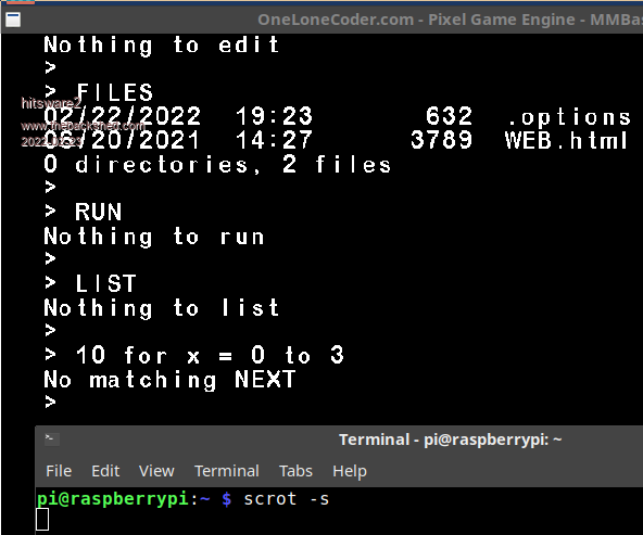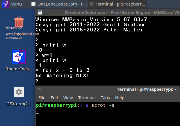 Not sure what you're saying. The error you get with FOR on the command line and no NEXT is the same for MMBasic on any device. PicoMite, Armmite F4, SensorKits, MMBasic Hardware, Games, etc. on fruitoftheshed |