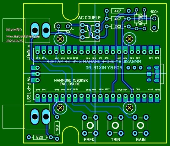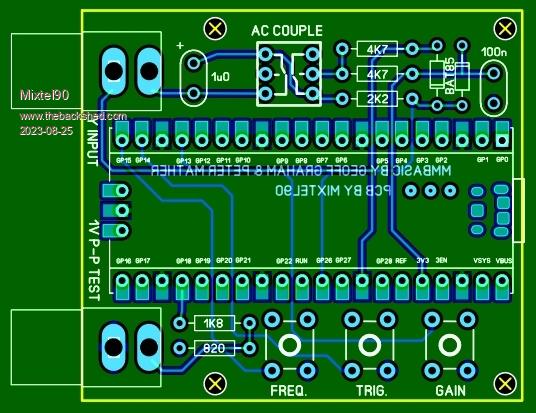 Phill your idea works up to 10KHz,nice start. cheers stan SetPin GP18,pwm1A 'this optional test signal comment out PWM 1,10000,30 'square wave ,this optional test signal comment out dim c%,x%,samples!(360),freq%,cyc% SETPIN GP7, FIN pause 1000 freq% = pin(GP7) cyc% = 4 'number of cycles to display. freq%=freq% * MM.HRES / cyc% ' freq of ADC for cyc% cycles on screen 'print freq% SETPIN GP26, AIn adc open freq%,1 '500000,1 'samples per second |