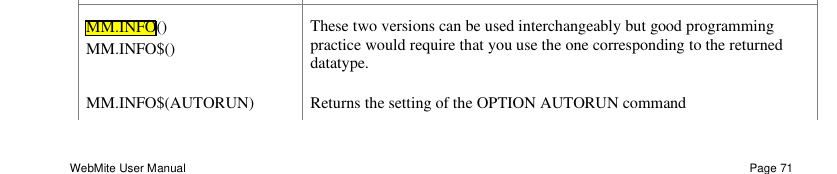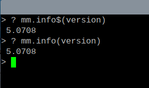 Hi Hans, From the Documentation: This is regardless of whether you specify MM.INFO(VERSION) or MM.INFO$(VERSION). Also, that "volvo","saab",... bit, I recall seeing that on Mozilla.org. Cheers, Chris |