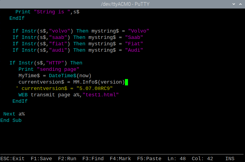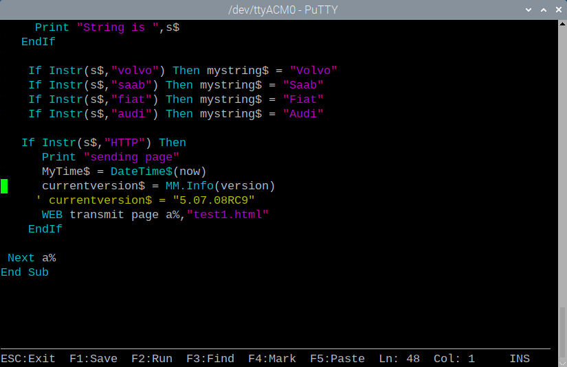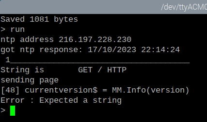 @matherp Hi Peter; I don't know if this is an error or my understanding of mm.info$(version) as used in a .bas web program. I 1st saw this in RC8, don't know if it goes further back. I am using RC9 on webmite. ![]() From 5.07.07 manual I saw this; ![]() Tested on command line , no errors; ![]() Used it in a web program as follows; ![]() Saved and ran the web page and got the following error; ![]() F4 into editor which takes me to the error and the $ is missing; ![]() This is repeatable every time. Why is the $ disappearing on F1 and/or F2 in the editor? Suggestions? Thanks for all your hard work. If you need more info, no pun intended, let me know Hans ... ![]() PS: Tested on RC4 of Picomite same error in editor, $ disappears and throws error. Edited 2023-10-18 13:03 by Hans |