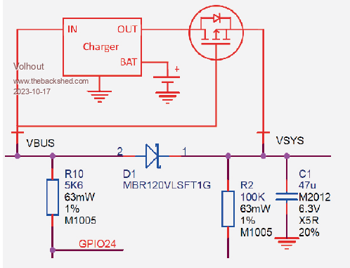 I agree with Lizby. @Volhout Two questions: 1. Which P-channel MOSFET do you suggest? 2. In case 6 we have to connect the output current (+) to VSYS, right? Sketch 2 is build on sketch 1 and sektch 3 is build on sketch 2. Step by step, very nice. I think that can be summed. Many thanks Edit: In sketch 2 and 3 is the Gain of the Mosfet connected to VBUS. Is 5V power on the USB connector or VBUS, the battery will be switched to off. Right? Gregor Edited 2023-10-18 04:49 by aFox |