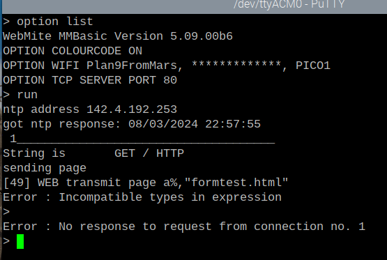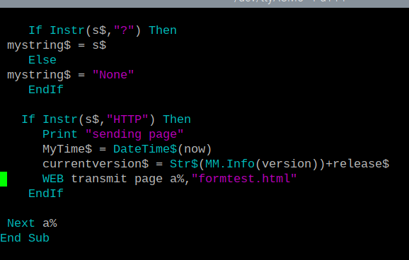 Hi All; Just trying 5.09.00b6 and getting an error on web transmit page command. The error happens as soon as you try to open the web site with the browser. ![]() Worked in 5.08.00 did not try this with other betas Here is the error line; ![]() Got the same error with the example from the manual. Suggestions or comments. Thanks, Hans ... |