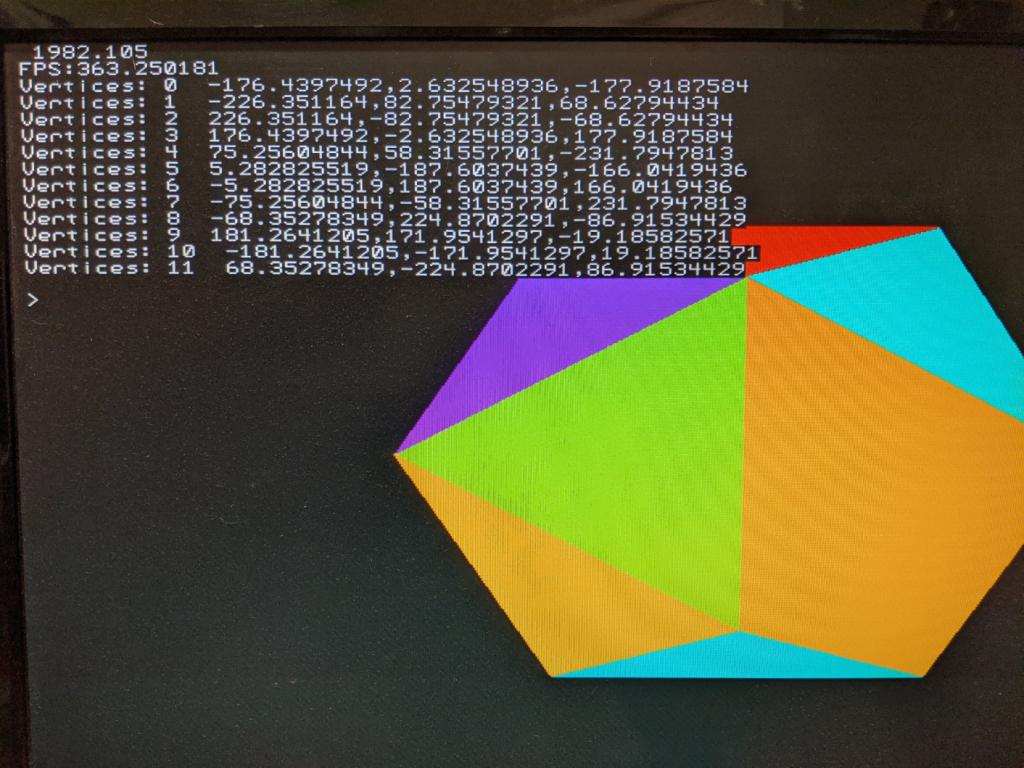 Guys I'm starting to convert in C so please can you check my math. Below is the Basic program that loads up the initial state of a 3D object - surprise, surprise it is an octahedron. Then below that is the diagnostic print from the firmware. First it confirms I've stored the coordinates correctly. Then it prints out details for each face, the vertex numbers, the calculated positions of the centroids of each triangle (to be used for Painters) and finally the calculated surface normals for each face based on the 1st point-2nd and 3rd-2nd. It is this latter that I really need to be sure of before I go any further. option explicit option default float dim integer nv=6, nf=8 ' octahedron has 6 vertices and 8 faces 'array to hold vertices dim v(2,nv-1)=(0,250,0, 250,0,0, -250,0,0, 0,-250,0, 0,0,250, 0,0,-250) ' array to hold number of vertices for each face dim integer fc(nf-1) =(3, 3, 3, 3, 3, 3, 3, 3) 'array to hold vertices for each face dim integer fv(math(sum fc())-1)=(0,5,2, 0,1,5, 0,2,4, 0,4,1, 3,2,5, 3,5,1, 3,1,4, 3,4,2 ) draw3d create 1, nv, nf, v(), fc(), fv() draw3d close all 6 vertices, 8 faces X, 0.0000,Y, 250.0000,Z, 0.0000 X, 250.0000,Y, 0.0000,Z, 0.0000 X, -250.0000,Y, 0.0000,Z, 0.0000 X, 0.0000,Y, -250.0000,Z, 0.0000 X, 0.0000,Y, 0.0000,Z, 250.0000 X, 0.0000,Y, 0.0000,Z, -250.0000 Face 0 vertices , 0, 5, 2, -83.3333, 83.3333, -83.3333, 0.5774, -0.5774, 0.5774 Face 1 vertices , 0, 1, 5, 83.3333, 83.3333, -83.3333, -0.5774, -0.5774, 0.5774 Face 2 vertices , 0, 2, 4, -83.3333, 83.3333, 83.3333, 0.5774, -0.5774, -0.5774 Face 3 vertices , 0, 4, 1, 83.3333, 83.3333, 83.3333, -0.5774, -0.5774, -0.5774 Face 4 vertices , 3, 2, 5, -83.3333, -83.3333, -83.3333, 0.5774, 0.5774, 0.5774 Face 5 vertices , 3, 5, 1, 83.3333, -83.3333, -83.3333, -0.5774, 0.5774, 0.5774 Face 6 vertices , 3, 1, 4, 83.3333, -83.3333, 83.3333, -0.5774, 0.5774, -0.5774 Face 7 vertices , 3, 4, 2, -83.3333, -83.3333, 83.3333, 0.5774, 0.5774, -0.5774 |