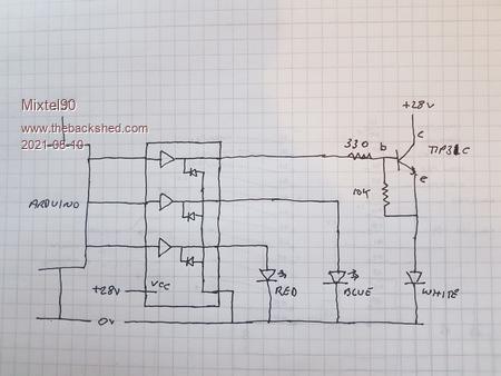 Plenty of drive current (>50mA even with 3x 100mA leds lit) available from a UDN chip, Jim. You only need a gain of 18 at most so a darlington is probably overkill. There may not even be 3 LEDs, only 2 (red/blue). A TIP32C should do it easily at less than half the cost. No driver transistor, just the UDN chip, 2 resistors and a TIP32C. That's all that's needed for a 900mA white and up to 3 100mA colours. All logic inputs into the UDN. All continuously rated. Will probably work with PWM too, if the frequency is kept down to something sensible. It appears that the UDN chip is no longer manufactured and is no longer listed by RS and Farnell. However, Toshiba have released the TBD62783A which is an excellent DMOS replacement with lower power dissipation. RS sell the through-hole DIP (PG) version for 8.65 UKP +vat for a pack of 10. You can get the TIP32C for 49p each. Ignoring postage, that's less than 2 quid +pcb for a complete driver package. Edited 2021-08-10 18:31 by Mixtel90 Mick Zilog Inside! nascom.info for Nascom & Gemini Preliminary MMBasic docs & my PCB designs |