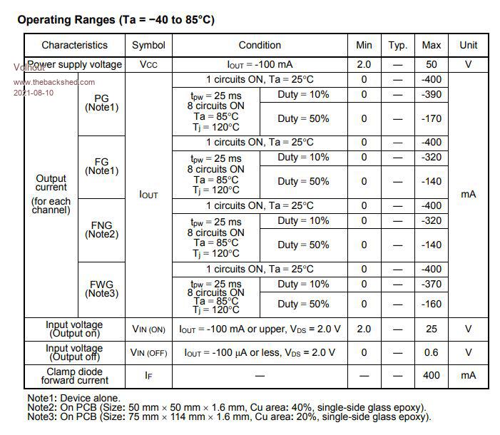 OOPS! My idea of driving a PNP from that chip doesn't work as I'd originally intended, sorry. It should be an NPN as an emitter follower. I'd forgotten that it's a high-side driver. I failed... :( The turn-off resistor should be to the emitter of course (top end of load should be ok. Output leakage is very low and won't light the LED). Base resistor could be about 330R. It just gives some protection to the chip output. Turn-off resistor, say, 10k. Luckily a TIP32C (NPN) is about the same price. :) You still have maximum total input current into the supply pin. You can't get 500mA from all 8 outputs at the same time, even if you could stay within the package power rating. They don't state that maximum current, but 500mA total would make sense for a single pin on a DIP package. Note that they show 400mA max output with one circuit ON. I don't think you can get 900mA *continuous* through the pin under any circumstances (not without sub-zero chilling anyway :) ). You may be able to get 900mA *short pulses*, but that's not what's wanted. Inputs are dead easy. Direct connection to the arduino pins. :) ![]() Edited 2021-08-10 20:15 by Mixtel90 Mick Zilog Inside! nascom.info for Nascom & Gemini Preliminary MMBasic docs & my PCB designs |
