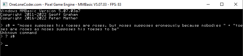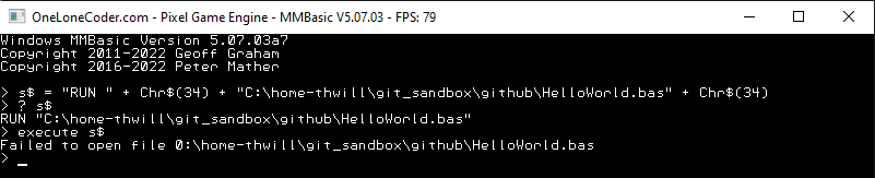 Good morning Peter, Here are four for your delectation: 1. OPTION DEFAULT MODE without an argument (done through fat fingers) hangs and then crashes MMB4W. 2. Setting OPTION DEFAULT FONT <num> and then using FILES or causing an ERROR returns to the font that MMB4W was originally started with instead of the new DEFAULT FONT. 3. Weird EXECUTE sh*t, note the mysterious "0" at the start of the path it tried to open: ![]() Also can I suggest that: 4. You should actively prevent the user typing a command at the prompt longer than the window (ideally sound the bell) instead of: ![]() ... or even better support commands at the prompt that extend over multiple lines (up to the usual 255 character limit). Best wishes, Tom Edited 2022-02-23 20:40 by thwill MMBasic for Linux, Game*Mite, CMM2 Welcome Tape, Creaky old text adventures |