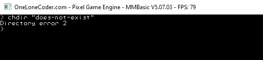 Good morning Peter, A fresh selection for your delectation: 1. Setting OPTION DEFAULT PATH immediately changes the current working directory to the new default path. Is this intended? I was suprised. 2. CHDIR into a non-existing directory produces a "rubbish" error message: ![]() 3. I think you should add a mechanism to read environment variables (it would certainly help with my unit-test framework), especially HOMEDRIVE, HOMEPATH and TMP. MMB4L uses MM.INFO$(ENVVAR name$) though that obviously can't handle > 255 chars for which MMB4L users would currently need to use SYSTEM. 4. MM.INFO$(DIRECTORY) does not work the same in MMB4W as it does on the CMM2 (or MMB4L). On the CMM2 you always append the separator "/" but in MMB4W you currently don't append a separator ("\") except when the current directory is the root, e.g. "C:\". Note that CWD$ and MM.INFO$(DIRECTORY) historically have different behaviour in that CWD$ only appends the path separator when the current directory is the root, e.g. "A:/" 5. YMMV but it would aid portability if all your MMBasic implementations supported MM.INFO$(SEPARATOR) to return "/" or "\" as appropriate ... that's assuming you don't want to force MMB4W to automatically convert to the "/" separator used by the CMM2. Best wishes, Tom Edited 2022-02-24 20:15 by thwill MMBasic for Linux, Game*Mite, CMM2 Welcome Tape, Creaky old text adventures |