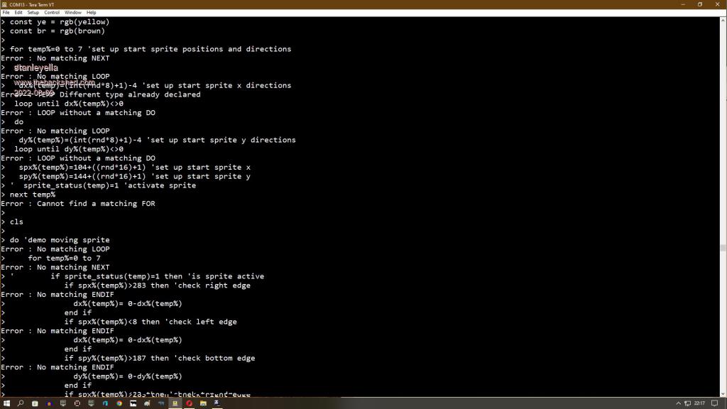 where you a "lad"? :) Or did you see the error of your ways? :) in the 80's data was 8bit numbers that represented z80 assembler commands that were poked into ram and called as usr. No error messages just rubbish on the display. using win the editing with a mouse eventually becomes the norm but some folk memorise shortcut key combinations. I have apologised for saying there maybe problems with rpipico/mmbasic/mmedit as it's a new implementation. mmedit doesn't need a terminal as I was told it has a poor one built in. Having only just got mmedit to work is it ok or would I be better of using notepad and copy/pasteing the code into teraterm? I read teraterm only copies 256 characters which is why files I've copied are corrupted with lines missing maybe. |
