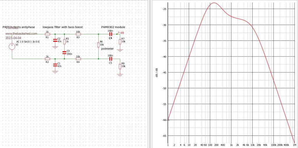 @mozzie, The small speakers Tom has, have terrible low frequency behaviour. ![]() But since the PAM8302 can drive enough power, we could boost the rolloff a bit. Below is an example how this can be done. This is by no means perfect, but the 2 components (R5,C3) boost some 5 db. The maximum is -23dB (@100Hz), with 24dB gain, the PAM8302 will bring this back to 0dB (2.8V accross the 8 ohm speaker = 0.6 watt). ![]() Volhout Edited 2023-04-04 06:04 by Volhout PicomiteVGA PETSCII ROBOTS |