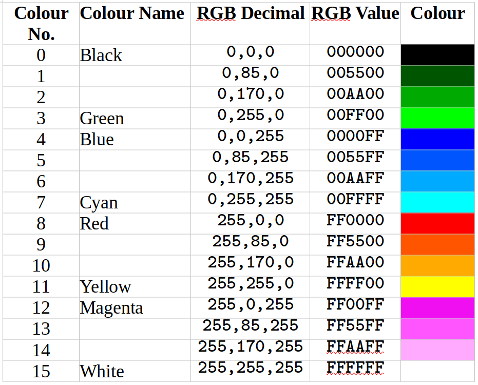 The RGB values are a bit pointless as they are 32 bit integers IIRC. It's far easier to use RGB(redvalue,greenvalue,bluevalue) and pop the ones that you want into an array at the beginning of your program. Then use something like cc(1) instead of RGB(yellow). There are only 16 colours anyway and no palette to choose them from. My comment was more around the fact that there is no visible indication of what the palette looks like, just the names of the colours in the text. I'm happy to create a table if it would help. The 32bit values are useful if you want to create a palette in a paint program to use for preparing your graphics for use with the PicoMiteVGA. I ended up Googling for the answer, but it would be more complete if the information was in the manual as well. Also, some people, when converting the bits to RGB values got them wrong, assuming 0, 1/4, 3/4, 1 for levels of Green, when they are really ), 1/3, 2/3, 1. Having it in the manual would remove any confusion. Can the numbers of the palette entries also be used, the same as the names? I saw a reference earlier that there is a difference between this usage on the PicoMiteVGA vs other Mites. |