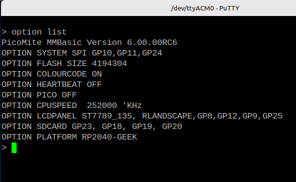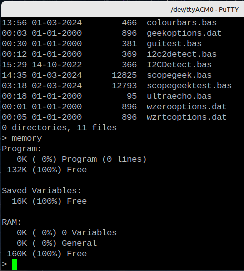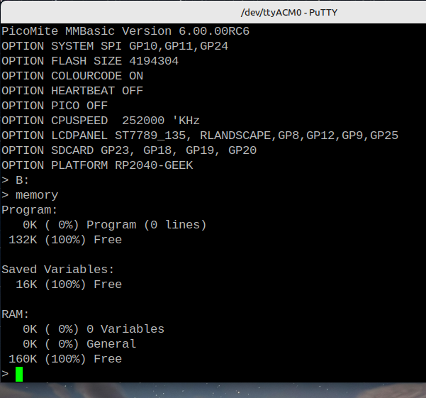 Hi All; I have tried 6.0RC6 on a number of my PICO builds and have not had any problems except when I tried it out on the RP2040-Geek. It worked properly on 5.9.0RC5 as in the screen shorts below; ![]() ![]() ![]() Cleared with clear_flash.uf2, Loaded 6.0RC6 shown with memory command, this shows normal at first. ![]() Executed Option Reset RP2040-Geek ![]() Executed B:[ENTER], note memory still looks normal ![]() After executing the FILES command I got a drive error and the memory usage changed. ![]() It would not read any sd cards that could be read on other PICO's. Reading the A: was not a problem. After I reloaded 5.9.0RC5 I was able to read the same SDCard again. I have done this exercise twice now with the same results. If you need more information please ask. Thanks, Hans ... |