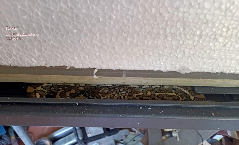 Last night I heard something get knocked over on the floor outside, had a quick look around no Idea what it was, next morning discovered the fan cover and mesh had been pushed off the top of the inverter cabinet and was on the floor, I had an idea what it was as there was a few carpet snakes around 2 nights back. Thought I would open the door on the inverter cabinet and discovered a carpet snake at the bottom of the door against the batteries, it was a bit of a job getting it out as it didn't want leave, got it out eventually it was in good condition so put it outside, it moved close to the camera lens so its a little blurry photo, will have to seal up the cabinet a bit better I think.
