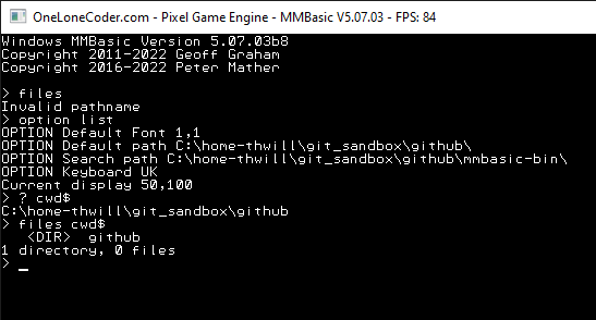... a state that lasted slightly less than two hours. This will crash MMB4W rather than report some sort of "File name too long" error: Option Search Path String$(255, "a") Also I would expect this to clear the SEARCH PATH: Option Search Path "" But it looks like it sets it to the current working directory, which I would think you would achieve with: Option Search Path "." or, of course: Option Search Path Cwd$ Best wishes, Tom Edited 2022-04-06 00:54 by thwill |