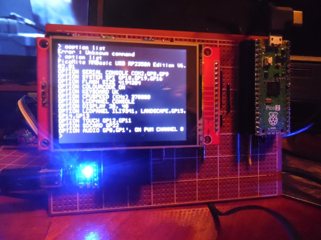I tried picomite 2350 usb on ili9341 and "eventually, 3rd flash firmware" mmcc let me type the options and it's like before, ie works. I forgot how I got it working the previous beta, downloaded tera term cos I remembered it. doh > option list PicoMite MMBasic USB RP2350A Edition V6.02.01 OPTION SERIAL CONSOLE COM2,GP8,GP9 OPTION SYSTEM SPI GP18,GP19,GP16 OPTION FLASH SIZE 4194304 OPTION COLOURCODE ON OPTION KEYBOARD UK OPTION CPUSPEED (KHz) 378000 OPTION LCDPANEL CONSOLE OPTION DISPLAY 20, 40 OPTION LCDPANEL ILI9341, LANDSCAPE,GP15,GP14,GP13 OPTION TOUCH GP12,GP1.1 OPTION SDCARD GP22 OPTION AUDIO GP0,GP1', ON PWM CHANNEL 0